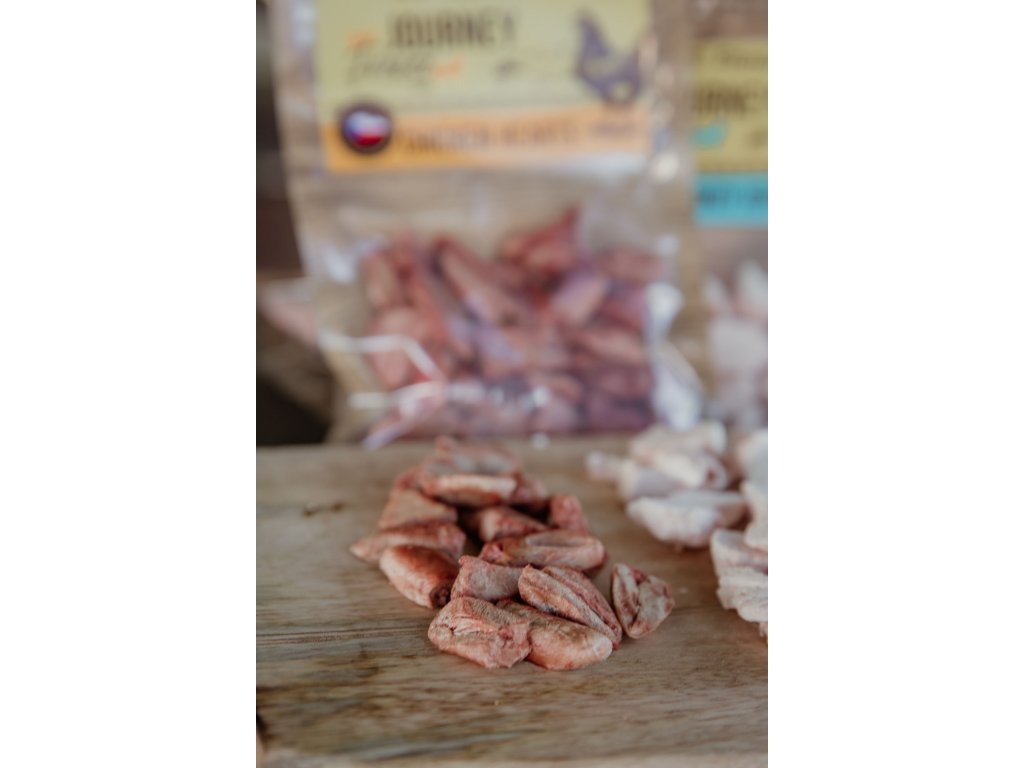 Delikatne, aromatyczne kawałki 100% kurzych serc — wielka motywacja także dla wrażliwych smakoszy. Delikatne suszenie mrozem zachowuje naturalny smak, zapach i strukturę. Serca są naturalnie chude, pełne wysokiej jakości białka i stanowią naturalne źródło tauryny (szczególnie cenne dla kotów), witamin z grupy B oraz minerałów, takich jak żelazo i cynk. Połówki serduszek, a nie kostki: łatwo je przełamać, nie kruszą się i wygodnie zabrać do kieszeni na trening. Przetwarzane i ręcznie pakowane w Czechach, u podnóża Gór Orlickich.