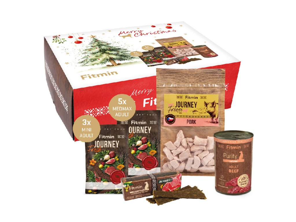 Nie szukaj już świątecznego prezentu dla swojego pupila – wybierz nasz świąteczny box Fitmin Fresh Journey. W środku znajdziesz karmę Fresh Journey, która jest aż o 80% świeższa niż zwykłe karmy granulowane, w dwóch rozmiarach – Mini dla małych ras i Medium & Maxi dla psów średnich i dużych ras dorosłych.